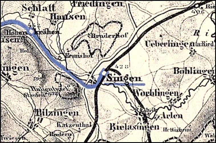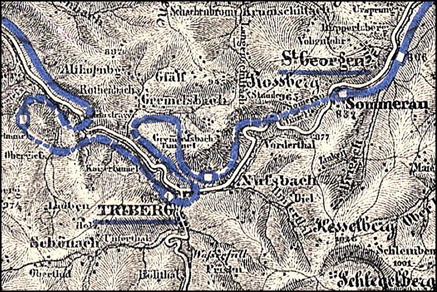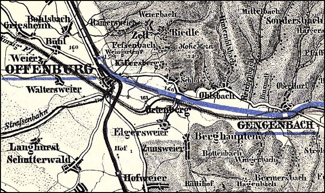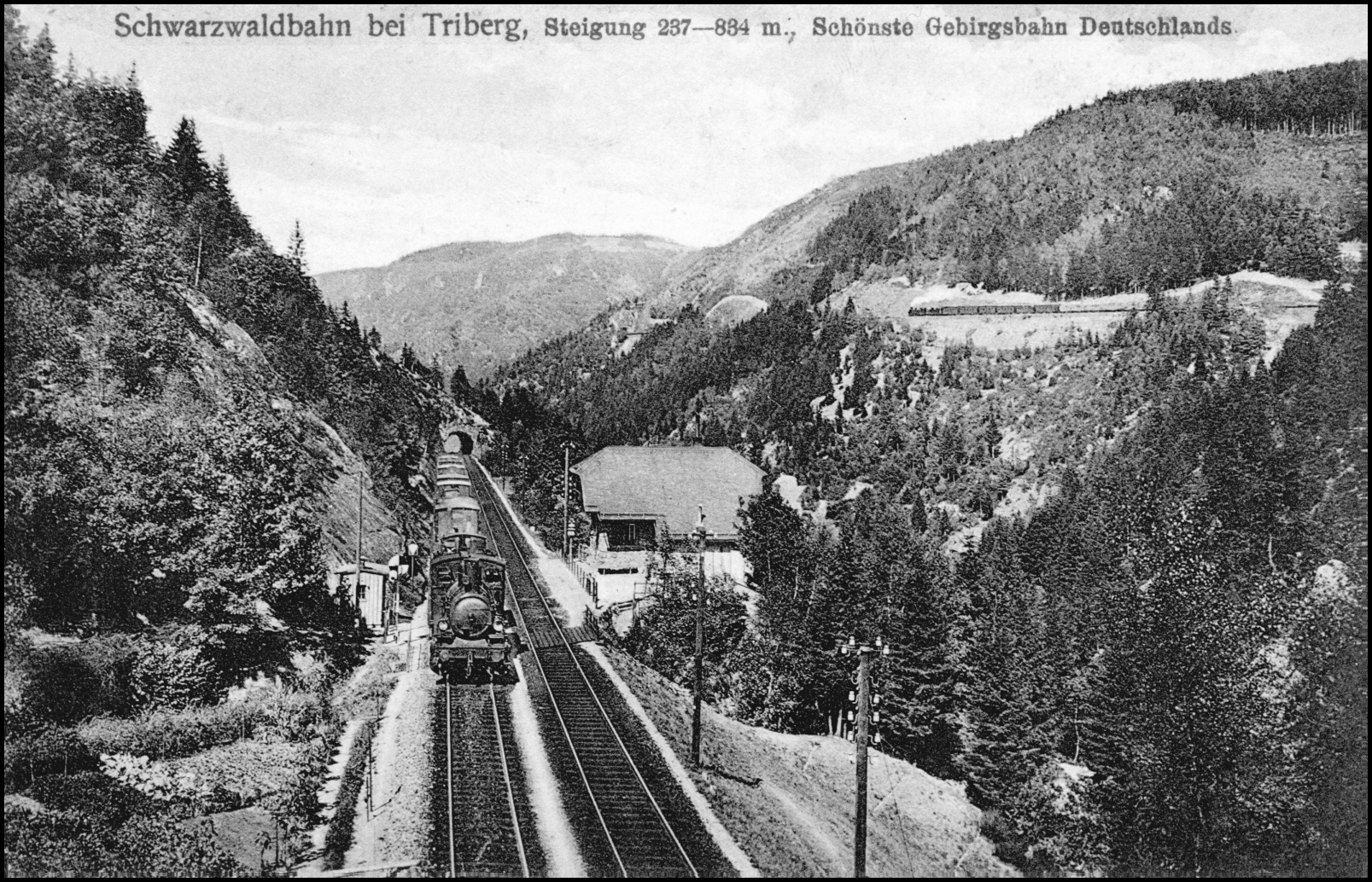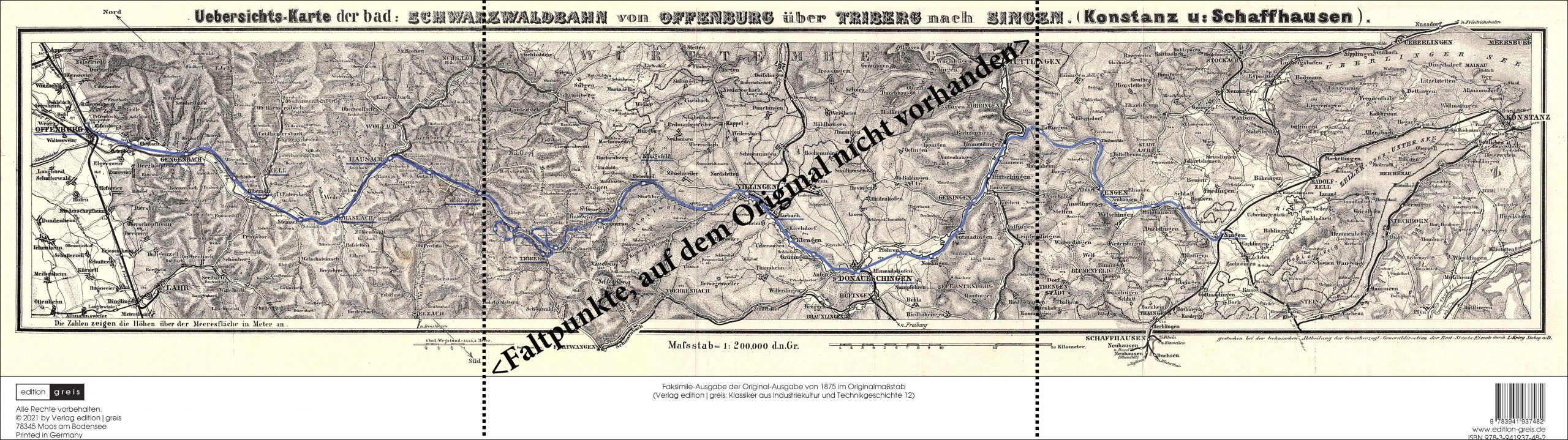 Diese Karte (Bild 1) zeigt als Faksimile-Druck im Originalmaßstab 1:200.000 den historischen Verlauf der Schwarzwaldbahn-Trasse aus dem Jahr 1873 von Offenburg durch das Kinzigtal (Bild 2) über Triberg und St. Georgen (Bild 3), Villingen und Donaueschingen bis nach Singen im Hegau (Bild 4). Die zeitgenössische Ansichtkarte in Bild 5 zeigt die »Schönste Gebirgsbahn Deutschlands«.